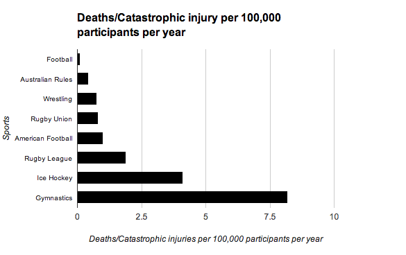 This graph shows the catasrophic/ fatal injuries per 100,000 participants in several different sports both contact and non-contact. The fact that really stands out on this graph is that gymnastics, a non-contact sport, is three to four times more dangerous in terms of spinal cord injuries and fatalities than Rugby Union, Rugby League and American Football.
