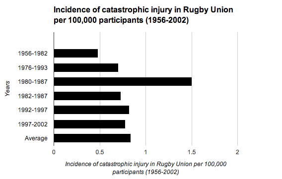This graph shows how many catastrophic/ fatal injuries there were per 100,000 Rugby Union players at all levels of the game in England from 1956 to 2002 based on a number of different overlapping studies by different research teams. It shows that the incidence of catastrophic injury does not appear to be changing over time even though in this time Rugby Union has become a professional sport.