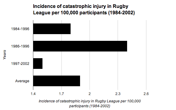 This graph shows how many catastrophic / fatal injuries there were in Australian Rugby League from 1984 to 2002. It shows just how few catasrophic/ fatal injuries there were for every 100,000 players at all levels.There is a limited amount of studies but from the data available it can be concluded that there is no strong trend upwards or downwards.