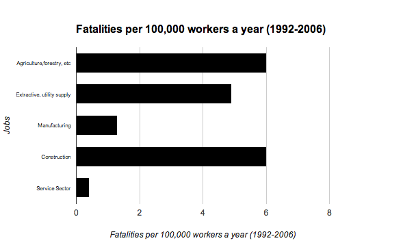 This graph shows how many fatalities as a direct result of work there were per 100,000 workers in jobs in the United Kingdom. What is most interesting about this graph is that in all the different work places the death rate is higher or the same as Rugby Union, Rugby League and American Football except in the service sector. I think this graph best shows that all three sports are still relatively safe and that parents run a bigger risk of having a life changing injury working than their children do playing the different sports.